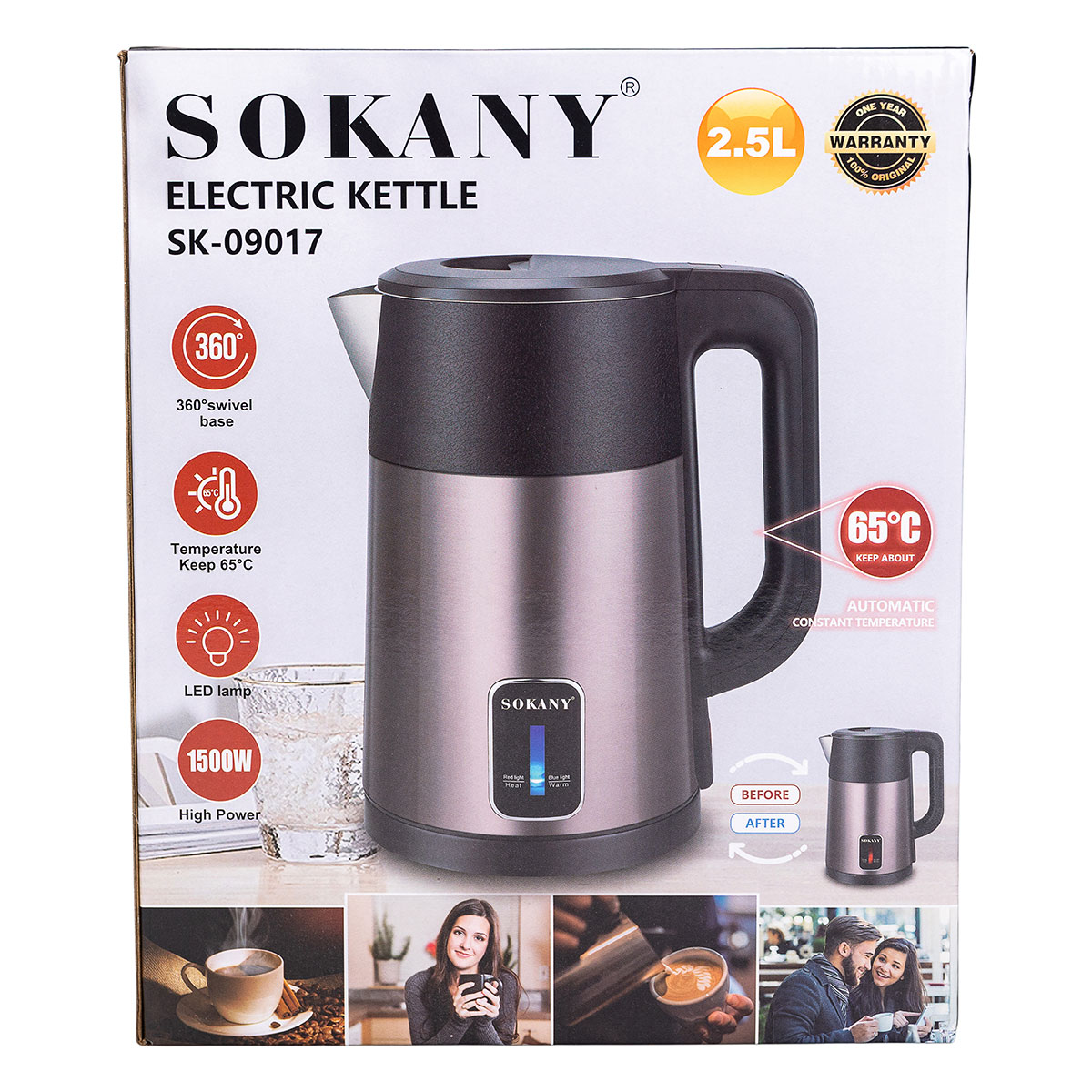 Електрочайник Sokany – практичний і зручний пристрій, який дає можливість за лічені хвилини закип’ятити воду і стане стильним доповненням будь-якої кухні. Чайник відрізняється оптимальним об’ємом для приготування гарячих напоїв для всієї родини, має дисковий нагрівальний елемент та поворотну основу.