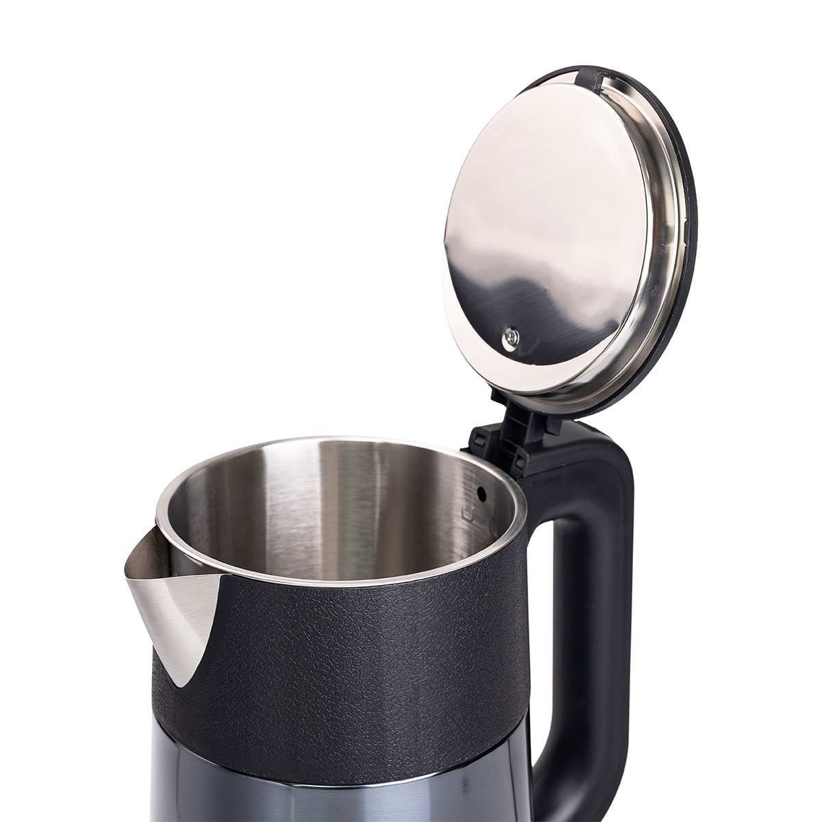 Чайник виготовлений із безпечних матеріалів, має захист від включення без води та зручну ручку, яка не нагрівається та забезпечує захист від опіків. Закритий нагрівальний елемент гарантує тривалий термін служби та просте очищення від накипу.